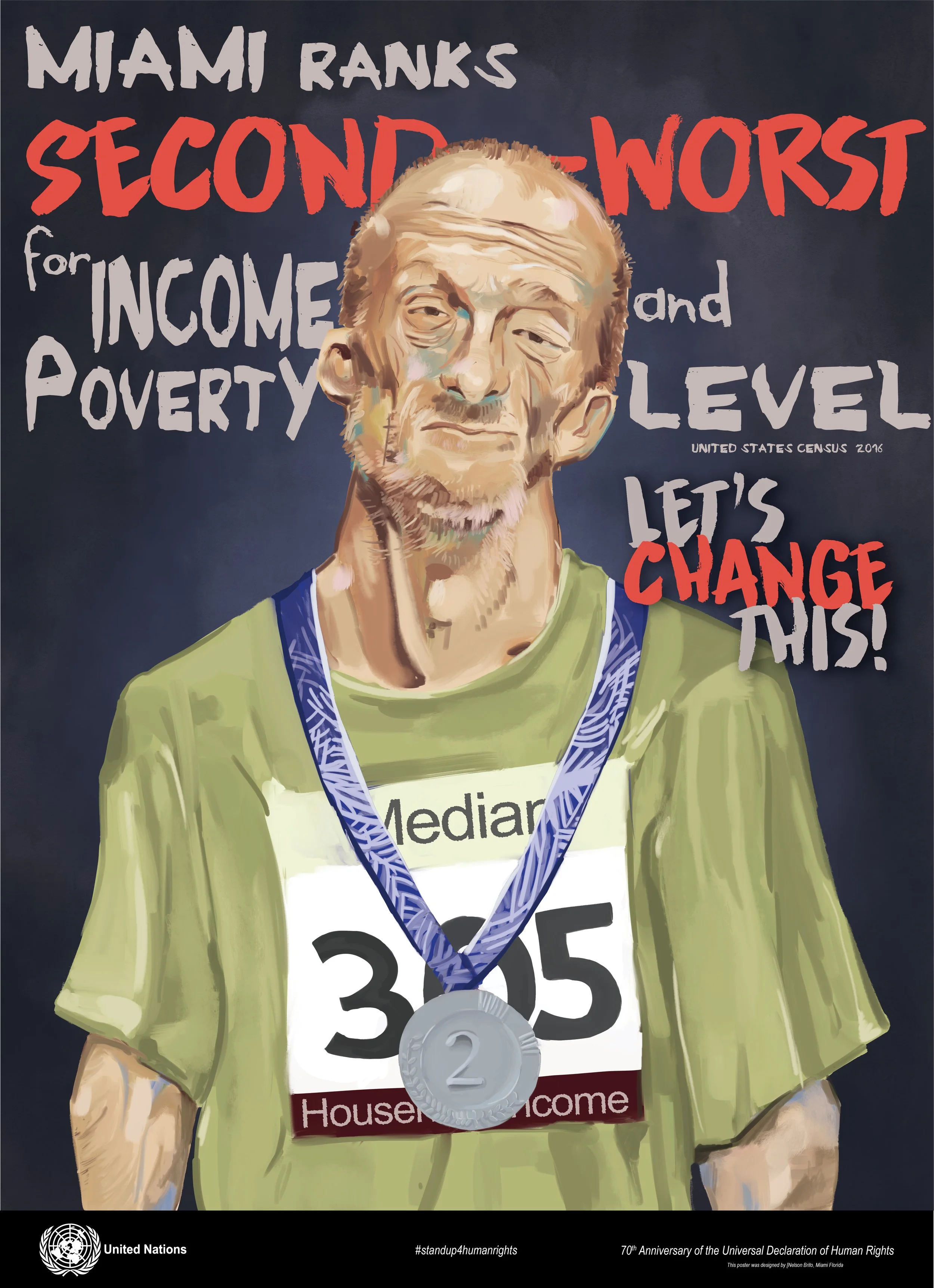 This concept poster aims at informing viewers of the current economic problem in the Miami area. The poster symbolizes the bad income and poverty as a race, where Miami came second. As a result of this info, the campaign urges the viewers to vote for the representative that can address this situation.